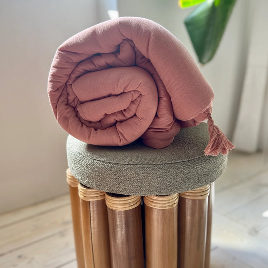 Alle vores tæpper fremstilles af bomuldsgaze af høj kvalitet. Dette lette og luftige materiale føles særligt blødt mod huden. Bomuldsgaze tillader tæppet at ånde, hvilket gør det ideelt til daglig brug uanset årstid. Tæpperne holder dig varm uden at blive klamme, og du mærker straks forskellen i komfort.