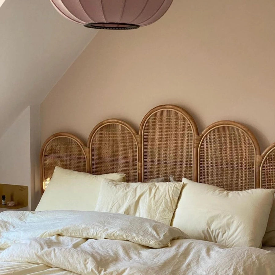 Sengegavl fremstillet af håndvævet økologisk rattan.